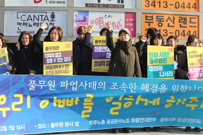이미 구속된 허철 조합원의 누님 허현숙님은 “당신들이 내세운 바른 먹거리에 희망을 가지고 빚을 내어 차를 샀고 잠을 못자고 운전해도 장시간 운전을 해도 가족을 위한 일이라고 견뎠다”며 “바른먹거리라고 자초한 풀무원이 소중한 모든 것들을 운송해주는 우리들의 가장을 돈으로 보고 있는건지 노예로 보고 있는건지 묻고 싶다”고 전했다. “한때는 아이들을 위해 풀무원 물건을 자주 먹였던 것이 후회가 된다”며 “어려운 길에 뛰어들어 원망도 했지만 인간답게 일하고 싶다는 우리 남편과 아빠들을 그냥 놔둘 수는 없다. 풀무원은 문제 해결을 위해 즉시 대화에 응해 달라”고 촉구했다.