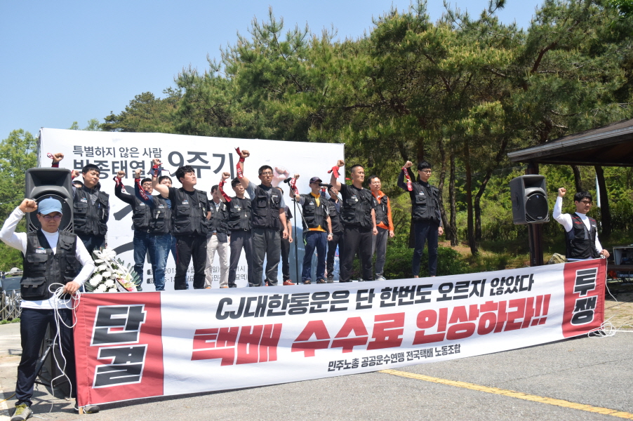 이어진 화물연대 오윤석 수석부본부장은 추모사를 통해 ‘어렵고 힘든 택배투쟁의 모든 과정에 열사가 있었다. 2009년 화물연대의 수많은 동지들은 매주 대전으로 버스를 대절해서 이동, 함께 싸웠다. 박종태 열사를 비롯한 화물연대 전 조합원이 17년간 외친 표준요율제가 화물자동차안전운임제라는 이름으로 2020년 시행 예정이다. 그러나 화물연대는 전 업종으로 확대하기 위해 싸움을 계속해 나갈 것이다. 아무도 안 해본 일이지만 조합원들의 힘으로 만들자. 박종태 열사의 꿈을 안고 이 꿈을 현실로 만들자.’며 투쟁의 결의를 다졌습니다.
