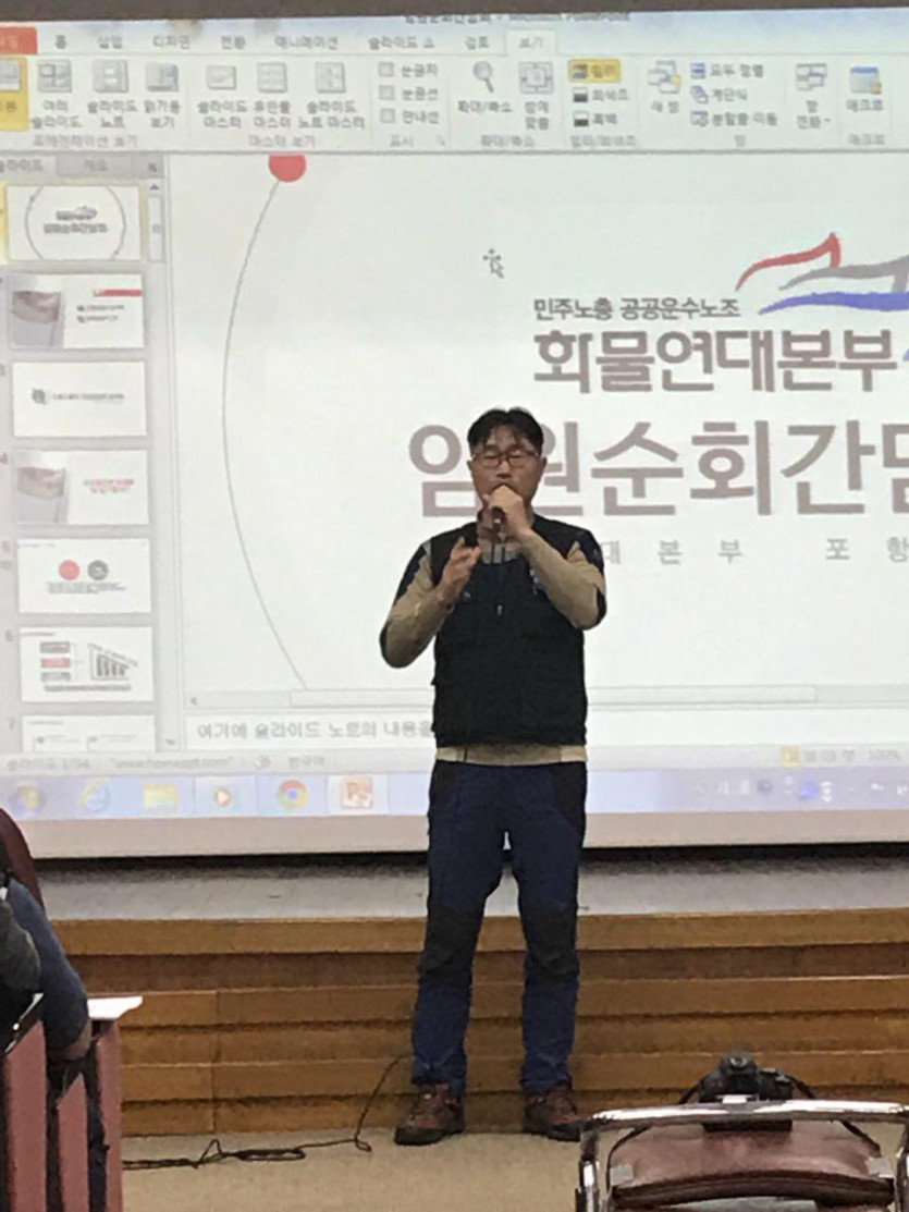 임원 전국순회 세 번째 지부로 2018년 5월 19일 포항근로자 복지회관 대강당에서 포항지부 간담회가 진행 되었습니다. 이날 간담회는 김태영 포항지부장을 비롯한 많은 포항지부 조합원들의 참여 속에 진행되었습니다.