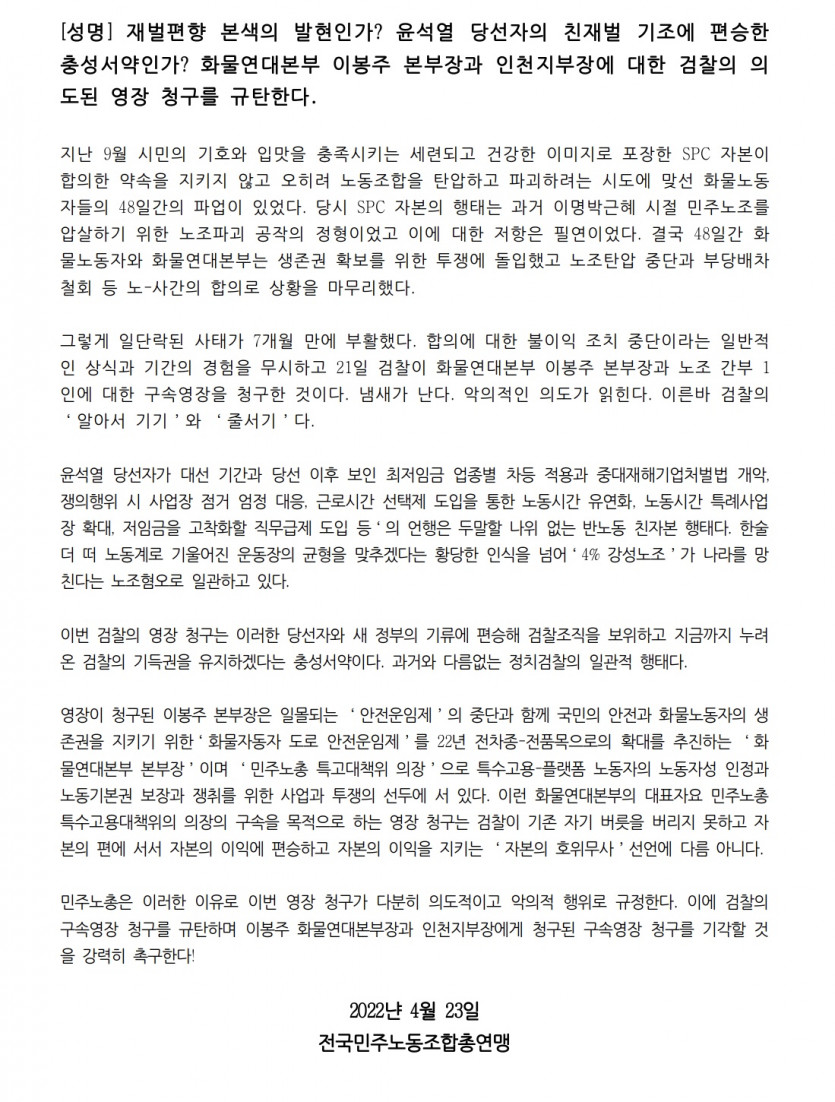 [민주노총 성명서] 재벌편향 본색의 발현인가? 윤석열 당선자의 친재벌 기조에 편승한 충성서약인가? 화물연대본부 이봉주 본부…