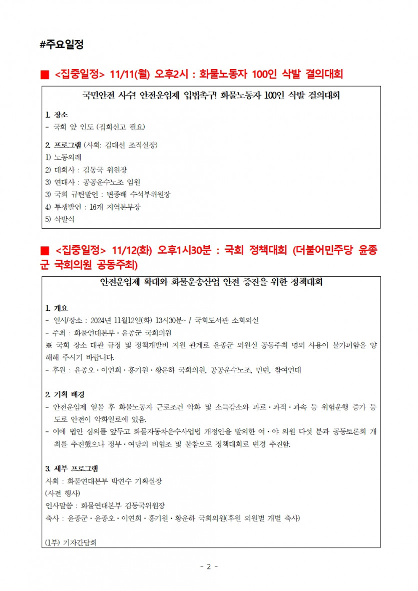 [취재요청서]_국회는 일해라! 안전운임제 차종/품목 확대 입법하라! <화물연대 국회 앞 농성 돌입 및 집중 상경투쟁>… 페이지 정보 작성자 화물연대본부 댓글 0건 조회 643회 작성일 24-11-17 18:36 목록 본문 이전글[보도자료]_국민안전 사수! 안전운임제 입법 촉구! 화물노동자 100인 삭발 결의대회 24.11.18 다음글[후속보도자료]_화물운송산업 구조개악 반대! 차종·품목 확대 안전운임제 쟁취! <화물연대 전국 동시다발 결의대회> 24.10.22 댓글 0 댓글목록 등록된 댓글이 없습니다.