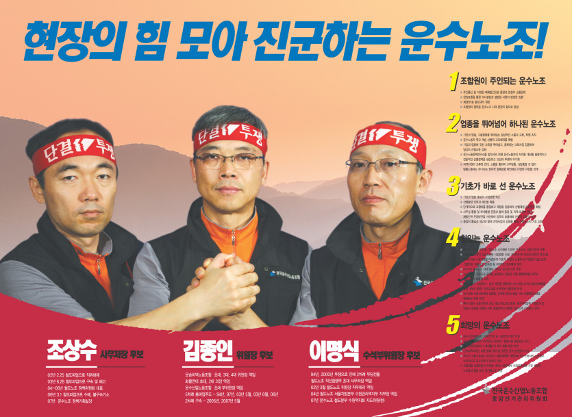 2007년 8월 18일부터 8월 24일 까지 실시된 전국운수산업노동조합 제2기 임원선거 투표결과 45,873명 중 38,583명(84.1%)투표하여 32,509명(84.3%)찬성으로 임원등록후보 위원장 김종인, 수석부위원장 이명식, 사무처장 조상수가 당선되었음을 공고합니다.