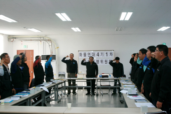 4일 운수노조 회의실에서 화물연대본부 4기 지도부의 첫 중앙집행위원회가 열렸다. 이날은 새로 당선된 본부장과 지부장들이 상견례를 가지며 새롭게 힘찬 출발을 결의했다. 회의에 들어가기 앞서 중앙선관위원장으로부터 당선증을 수여하는 자리가 있었다. 또한 본부 사무국 상근간부들과의 상견례도 진행됐다.