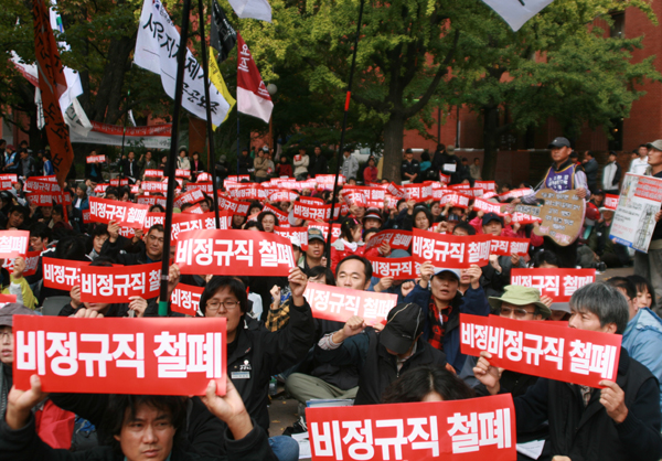 지난 10월 29일 통계청이 발표한 8월 현재, 경제활동인구 부가조사에 의하면 기간제는 25만 8천명으로 4.5%가 줄었으나 용역은 4만 8천명이 증가하였고 아르바이트 등 시간제 노동자도 2만 7천 명이 증가한 것으로 조사되었다. 비정규직 노동자의 평균 근속기간도 2년 2월에서 2년으로 줄었으며 상여금, 시간외수당, 유급휴가를 적용받는 비정규직 노동자 역시 줄어들었다. 비정규직 노동자의 절반 이상이 “당장 수입이 필요하기 때문에” 어쩔 수 없이 비정규직을 선택하고 있는 상황이다.