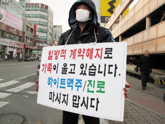 지난 2008년 12월 31일 사측으로부터 일방적 계약해지를 당해 길거리로 내몰린 전북 전주하이트1분회 조합원들은 현재 하이트맥주 전주지점 앞에서 천막농성을 진행하고 있다.