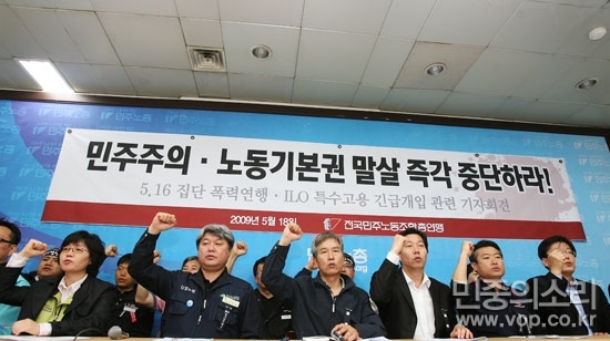 민주노총은 18일 5.16 전국노동자 대회 대규모 연행 사태에 대해 '민주주의와 노동기본권, 인권에 대한 정권의 도발'로 규정하고 유태열 대전경찰청장 사퇴, 이명박 대통령의 사과 등을 촉구했다.ⓒ 민중의소리 김철수 기자