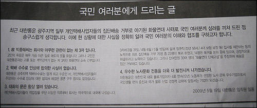 대한통운 택배기사들 중 상당수는 정규직이었다가 회사의 강압으로 '택배사업자'로 밀려난 분들이고 대한통운 노동조합은 이분들에게 별로 관심을 가지지 않았습니다.
