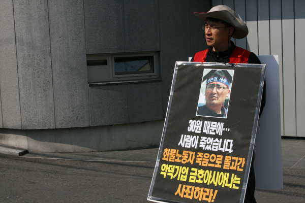 운수노조가 서울 한남동에 위치한 금호아시아나 박삼구 회장 집앞에서 1인시위를 진행하고 있다.