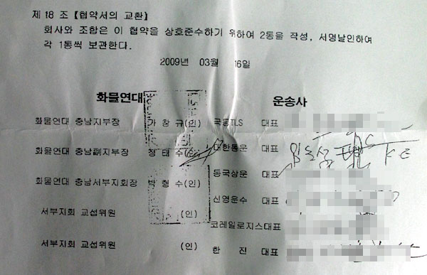 ▲ 화물연대와 대한통운 충남지사가 체결한 2009년 단체협약서 |