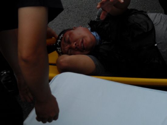 경비가 김 조합원의 몸을 밀치면서 계단 아래로 넘어져 머리 등을 다치는 부상을 당했다. 김 조합원은 현재 입원중이며 머리와 목, 허리 등에 통증을 호소하고 있다.