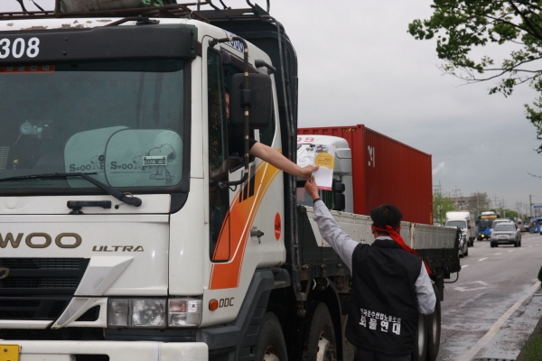 민주노총 공공운수노조(준) 화물연대본부가 11일 오전 10시 화물연대 인천지부 앞에서 국토해양부의 탈법적 화물차량 증차 저지를 위한 선전전에 돌입했다.