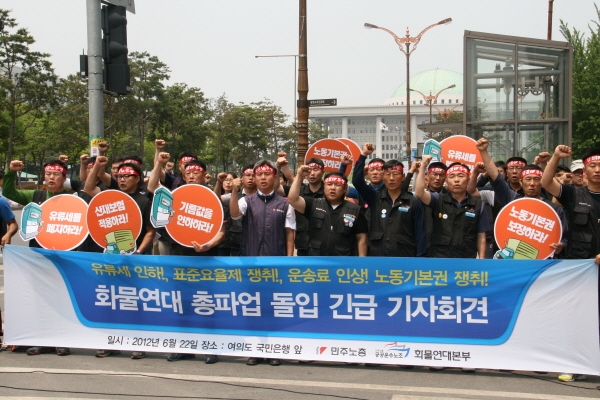 김달식 화물연대본부장은 이날 기자회견에서 “지난 2월 총파업 찬반투표 가결 이후 정부와 대화를 시도했지만 정부와 화주측은 무시했다”라며 “특히 정부는 2008년 약속한 표준운임제 법제화 약속마저 시범 실시 운운하며 차일 피일 미뤄왔다”고 지적했다.
