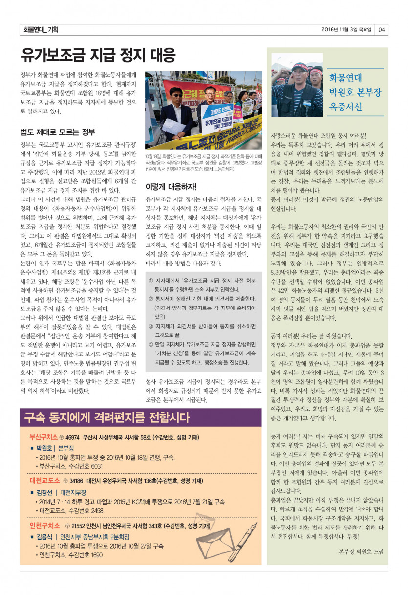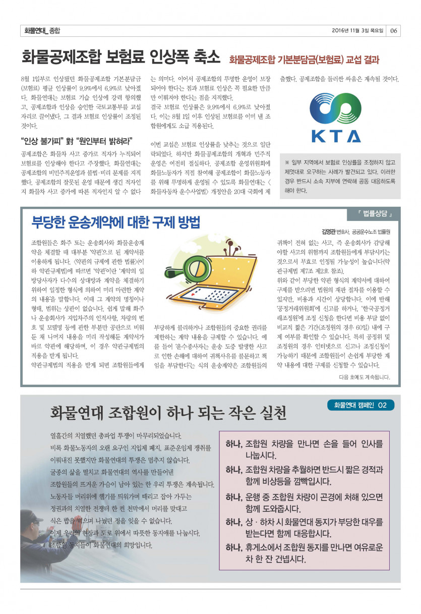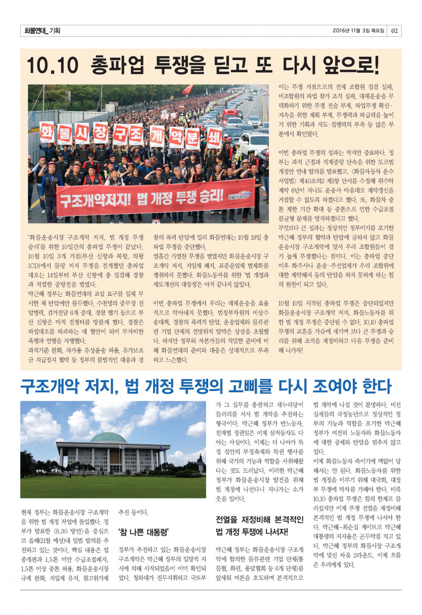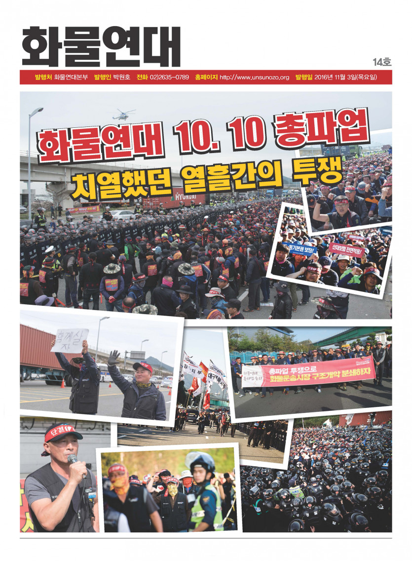 <화물연대> 14호 (2016년 11월) 페이지 정보 작성자 운영자 댓글 0건 조회 10,369회 작성일 16-11-03 16:11 목록 본문 <화물연대> 신문 14호 (2016년 11월호) 이전글[기획] 촛불이 이룬 정권 교체! 이번 기회 놓칠 수 없다! 17.06.12 다음글[칼럼] 주역을 통해 바라보는 세상 - 서리를 밟으면 단단한 얼음이 올 것이다 16.11.03 댓글 0 댓글목록 등록된 댓글이 없습니다.