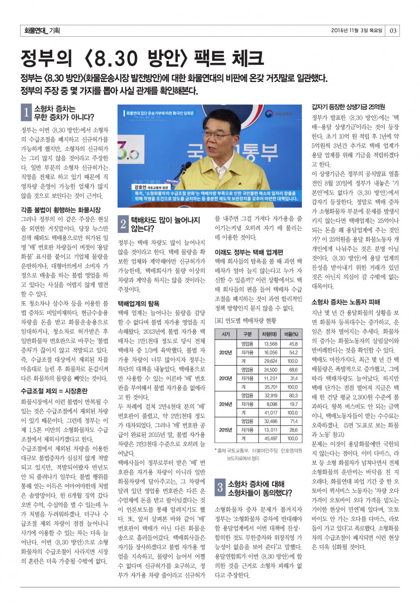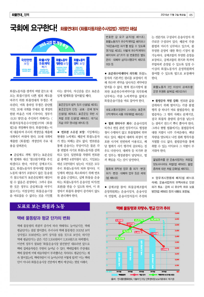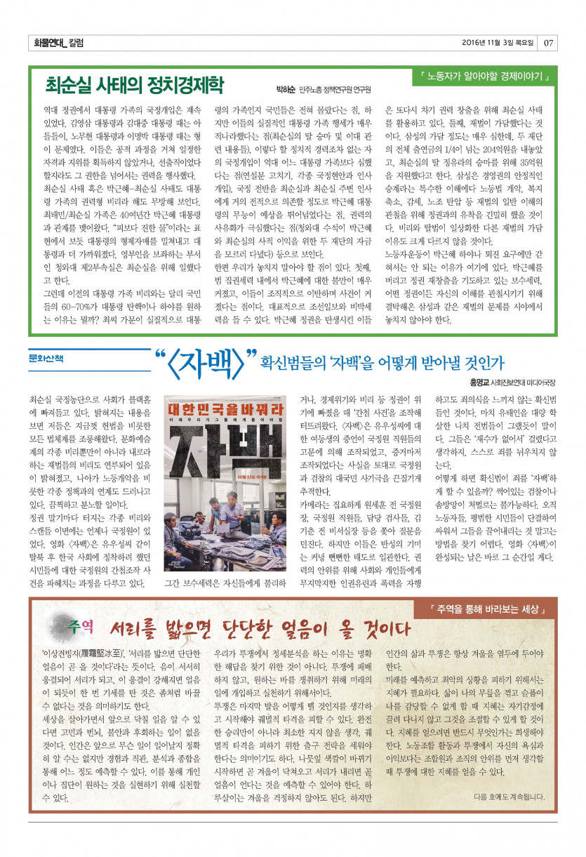 <화물연대> 14호 (2016년 11월) 페이지 정보 작성자 운영자 댓글 0건 조회 10,369회 작성일 16-11-03 16:11 목록 본문 <화물연대> 신문 14호 (2016년 11월호) 이전글[기획] 촛불이 이룬 정권 교체! 이번 기회 놓칠 수 없다! 17.06.12 다음글[칼럼] 주역을 통해 바라보는 세상 - 서리를 밟으면 단단한 얼음이 올 것이다 16.11.03 댓글 0 댓글목록 등록된 댓글이 없습니다.
