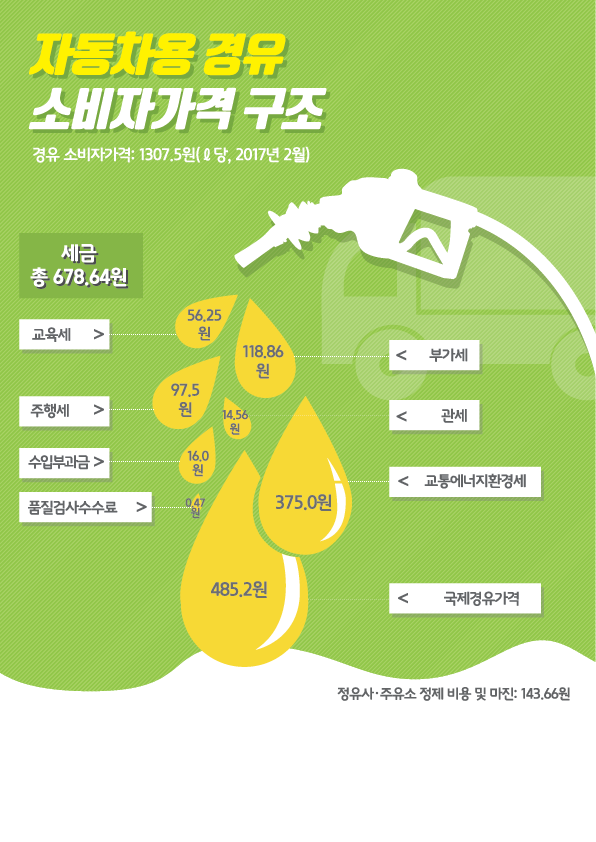 제19대 대통령 선거를 전후로 정부가 에너지 세제 개편을 모색하고 있다. 휘발유 가격 기준 대비 85%인 현재의 경유 가격을 조정(인상)하겠다는 것이다. 정부는 경유차를 줄이면 미세먼지를 감소시킬 수 있다는 이유를 내세우고 있다. 경유 가격을 인상하면 경유차가 감소한다는 논리다.