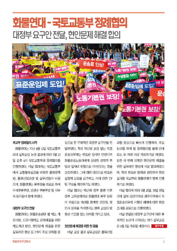 - 화물연대-국토교통부 정례협의: 대정부 요구안 전달, 현안문제 해결 합의