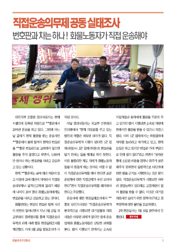 - 직접운송의무제 공동 실태조사: 번호판과 차는 하나! 화물노동자가 직접 운송해야