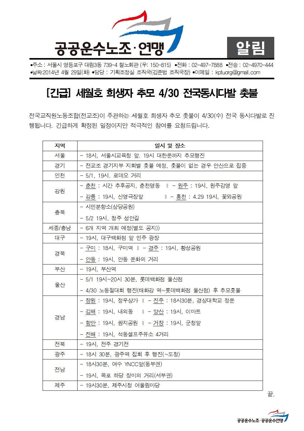 [긴급] 세월호 희생자 추모 4/30 전국동시다발 촛불 페이지 정보 작성자 화물연대본부 댓글 0건 조회 10,575회 작성일 14-04-29 10:12 목록 본문 [긴급] 세월호 희생자 추모 4/30 전국동시다발 촛불 이전글2014 노동절 전국일정 14.04.30 다음글5.1절 세계노동자대회 전국일정 14.04.28 댓글 0 댓글목록 등록된 댓글이 없습니다.