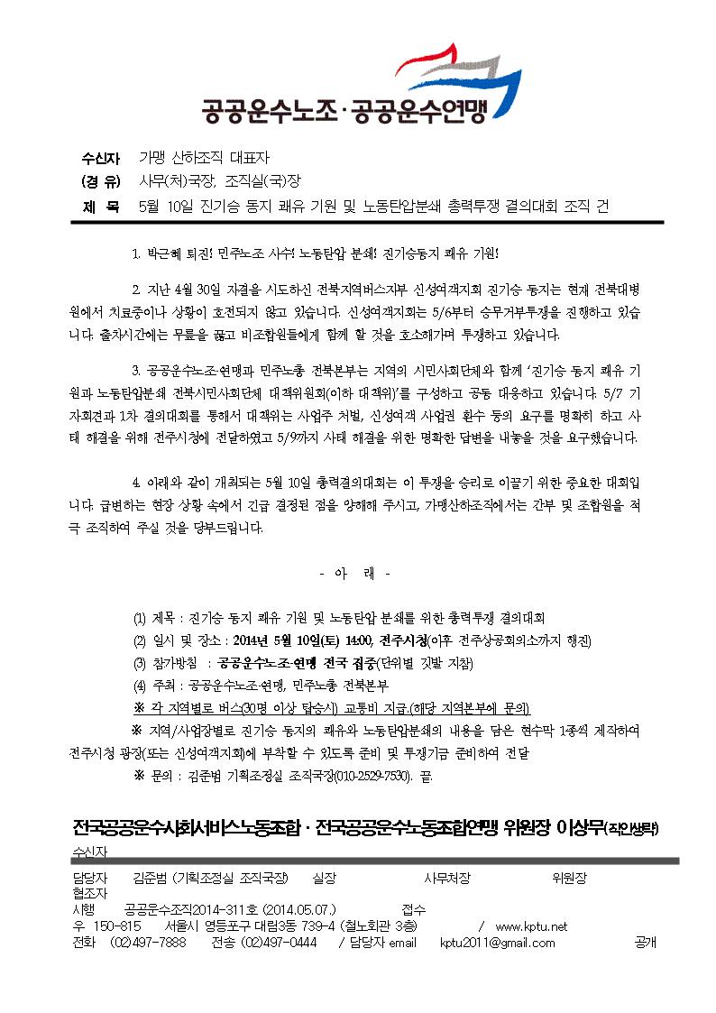 5월 10일 진기승 동지 쾌유 기원 및 노동탄압분쇄 총력투쟁 결의대회 조직 건
