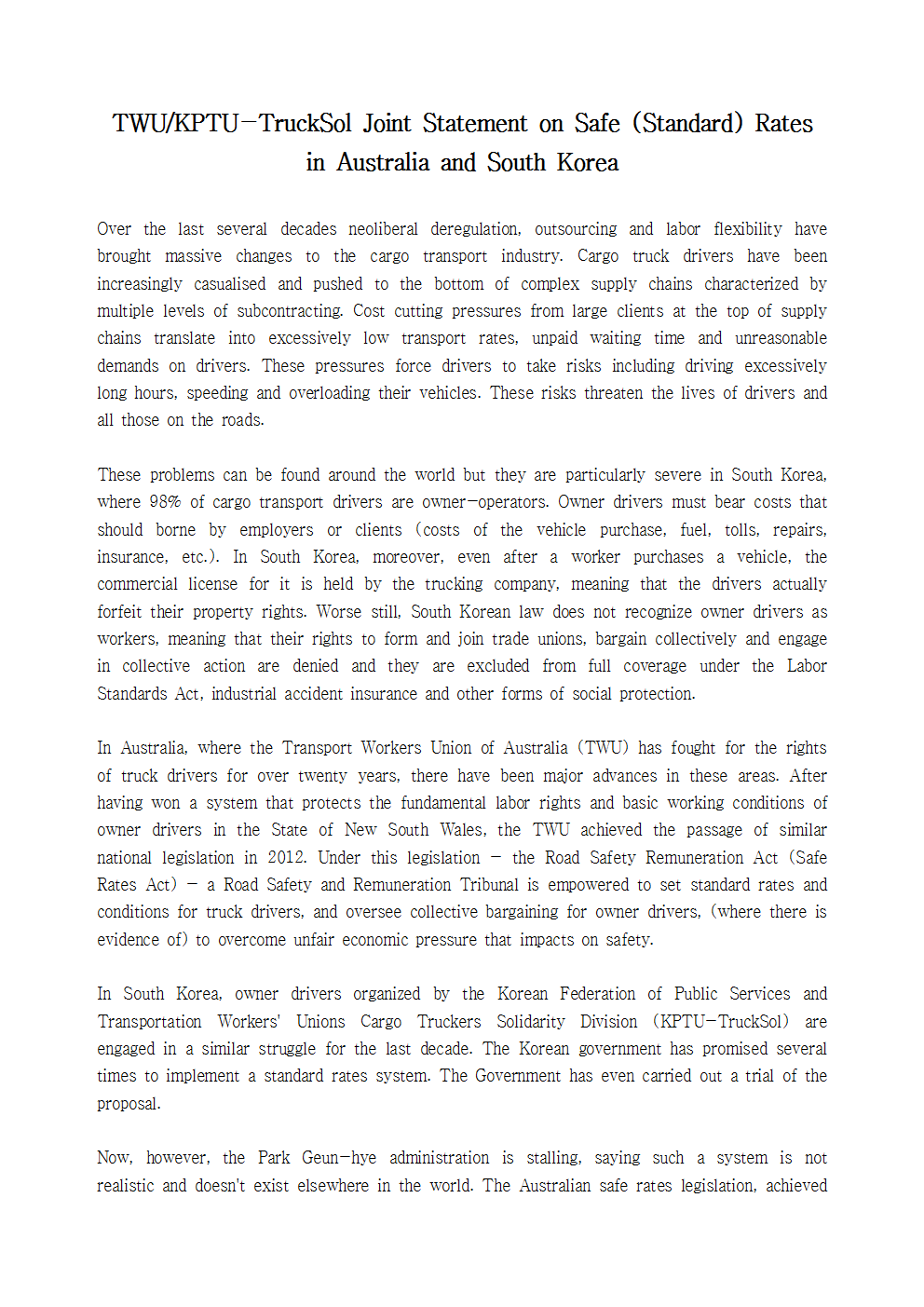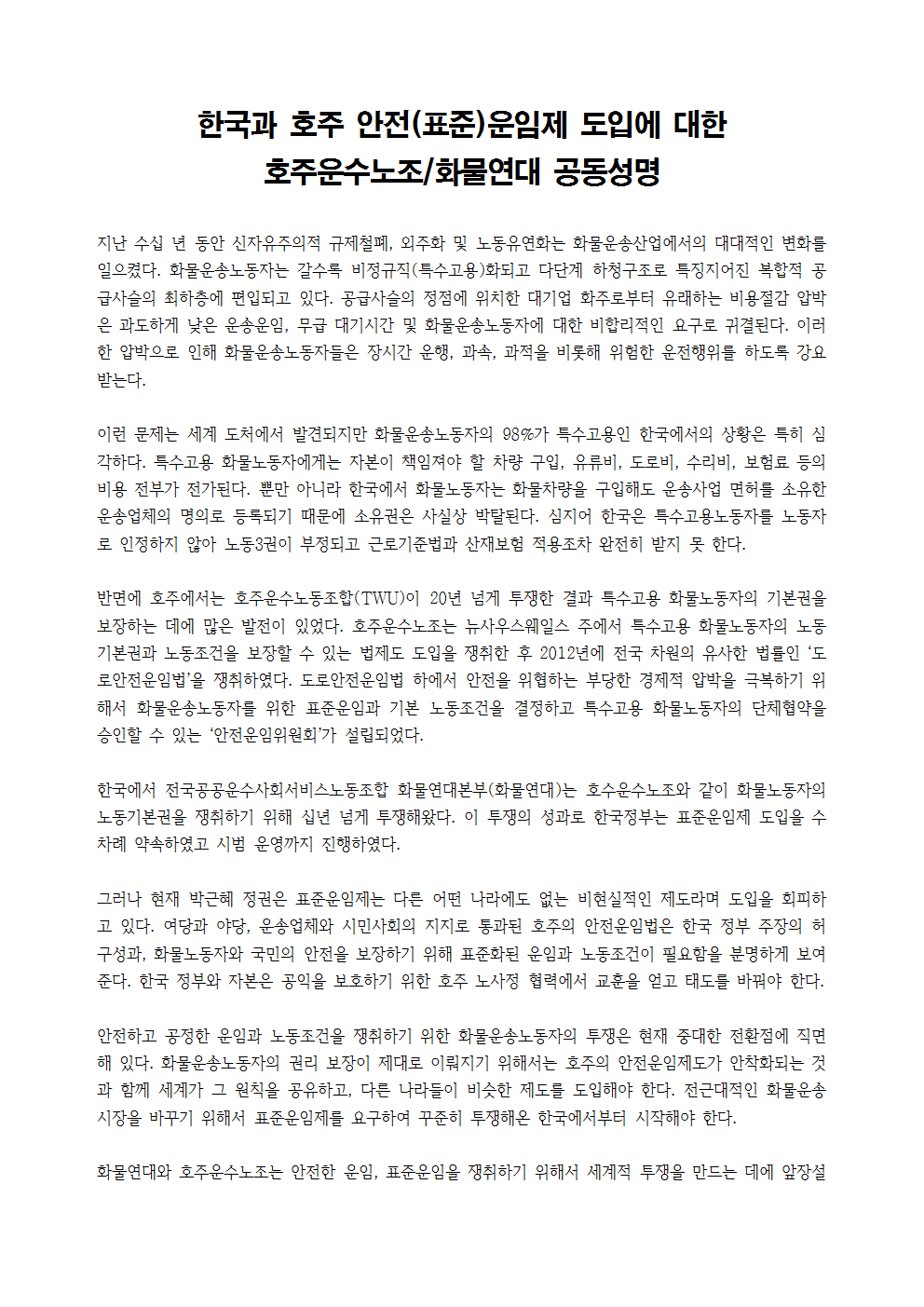 [성명]한국과 호주 안전(표준)운임제 도입에 대한 호주운수노조/화물연대 공동성명