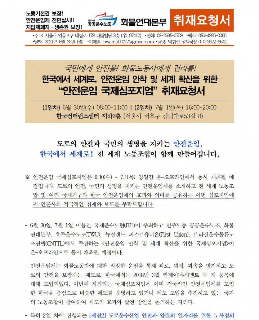 [취재요청서] 한국에서 세계로, 안전운임 안착 및 세계 확산을 위한 “안전운임 국제심포지엄”