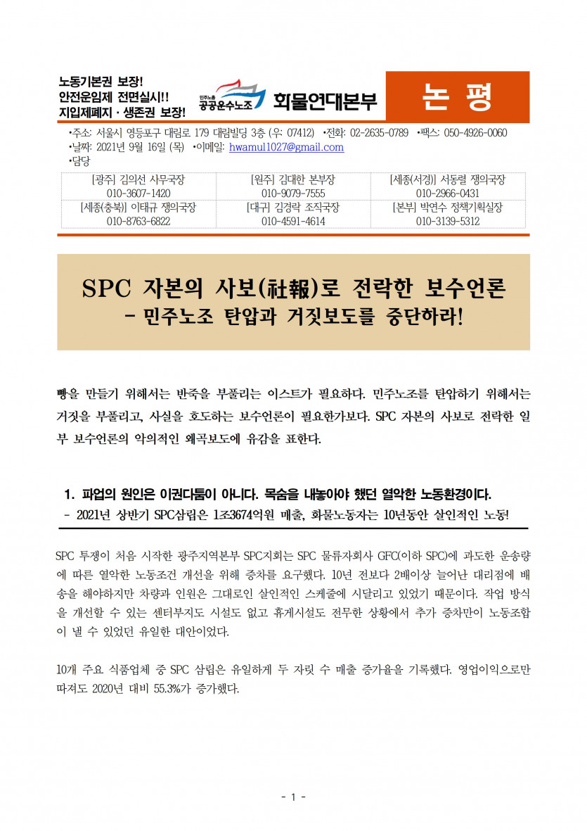 [논평] 20210917_화물연대본부 SPC투쟁 왜곡보도 관련 논평 페이지 정보 작성자 화물연대본부 댓글 0건 조회 5,867회 작성일 21-09-17 11:57 목록 본문 이전글[보도자료] 화물연대본부 파리바게뜨지회 SPC자본 규탄 공동 기자회견 21.09.17 다음글[보도자료] 210916_화물연대본부_광주spc지회_투쟁관련_입장발표_기자회견 21.09.16 댓글 0 댓글목록 등록된 댓글이 없습니다.