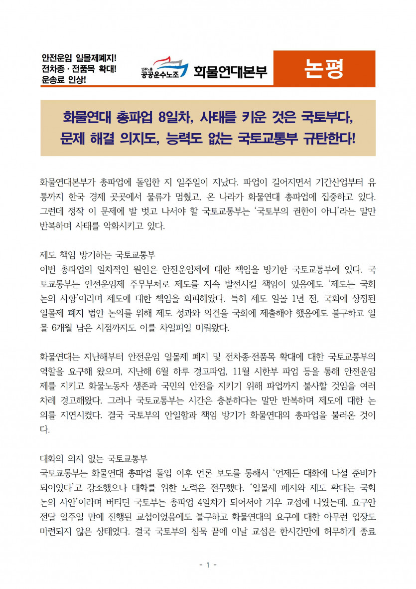 [논평]_화물연대 총파업 8일차, 사태를 키운 것은 국토부다, 문제 해결 의지도, 능력도 없는 국토교통부 규탄한다!
