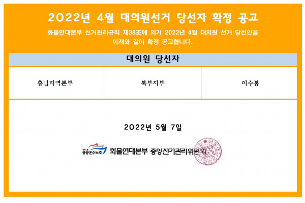 [공고] 2022년 4월 대의원선거(충남 북부지부) 당선자 확정 공고 페이지 정보 작성자 화물연대본부 댓글 0건 조회 2,378회 작성일 22-05-07 21:23 목록 본문 이전글[공고] 2023년 3월 대의원 선거 공고 23.02.27 다음글[공고] 2022년 4월 대의원선거 당선자 확정 공고 22.05.06 댓글 0 댓글목록 등록된 댓글이 없습니다.